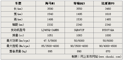 從上面的參數(shù)對比不難看出,海馬M1車身長度比QQ3、F0略大一點,車寬在兩款車之間,而軸距要比QQ3、F0小了一點點。在動力上,海馬M1搭載柳汽的LJ465Q系列1.0L發(fā)動機,最大功率47.5kw,最大扭矩85牛米,與QQ3的1.1L、F0的1.0L發(fā)動機相比,至少在數(shù)據(jù)上要遜色一點。