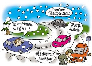 對(duì)于雪地的駕駛技巧,交警部門提醒車主,關(guān)鍵是以“慢”為主,并與前車保持足夠的剎車距離。然而,路況的復(fù)雜,讓很多駕駛員在發(fā)生側(cè)滑時(shí)感到緊張。“如果車輛打滑,方向盤要順著打滑方向輕輕地轉(zhuǎn),待車輪回正后,再輕輕地踩剎車。”“關(guān)鍵是要慢,平穩(wěn)地減速及輕踩剎車,絕對(duì)不要在冰雪濕滑的路面上猛起步,或緊急剎車!焙汲琴Y深出租車司機(jī)師傅們紛紛提供雨雪天氣駕駛竅門。
