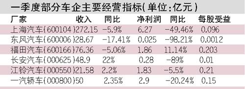 中國(guó)汽車(chē)工業(yè)協(xié)會(huì)的統(tǒng)計(jì)數(shù)據(jù)顯示,今年一季度汽車(chē)產(chǎn)銷(xiāo)256.76萬(wàn)輛和267.88萬(wàn)輛,同比增長(zhǎng)1.91%和3.88%。盡管結(jié)束了去年四季度銷(xiāo)量下降趨勢(shì),但從部分披露一季報(bào)的上市公司來(lái)看,由于一季度汽車(chē)銷(xiāo)量增長(zhǎng)主要是受小排量車(chē)和微客的帶動(dòng),而這兩類(lèi)車(chē)單車(chē)?yán)麧?rùn)偏低,利潤(rùn)豐厚的B級(jí)車(chē)出現(xiàn)了滯銷(xiāo)情況,導(dǎo)致大量車(chē)企出現(xiàn)“增產(chǎn)不增收”的怪現(xiàn)象,利潤(rùn)同比下降近五成,東風(fēng)和長(zhǎng)安的凈利潤(rùn)下降了八九成,只有個(gè)別企業(yè)出現(xiàn)一定車(chē)程度的增長(zhǎng)。