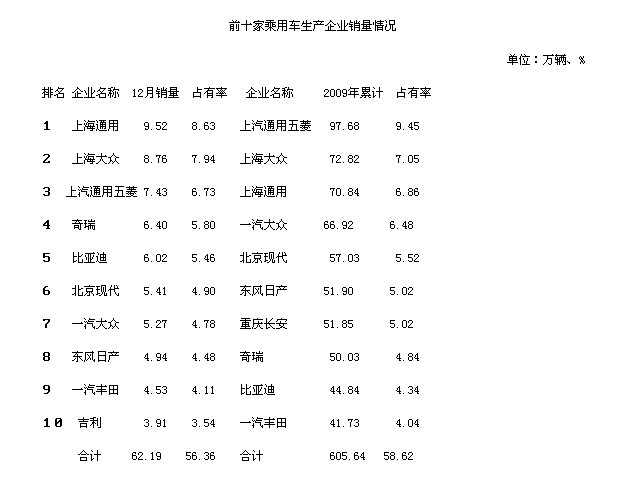數(shù)據(jù)顯示,受益于上汽通用五菱、上海大眾、上海通用的聯(lián)合發(fā)力,上汽去年銷量同比增長了57.23%,其中,生產(chǎn)微型車的上汽通用五菱貢獻了97.68萬輛的銷量,同比增長66.68%,為上汽鞏固霸主立下了巨大戰(zhàn)功。同樣受惠于購置稅減征和汽車下鄉(xiāng)雙重利好、以微型車為主的長安汽車,在整合了昌河、哈飛等微型車企業(yè)后,銷量大增至186.98萬輛,縮小了與其他“三大”的差距,并拉開了與“四小”的銷量差距。東風的銷量則是因旗下的神龍汽車、東風悅達起亞和東風日產(chǎn)在2009年均獲得50%以上的增長,公司整體銷量才保持了43.70%的增幅。