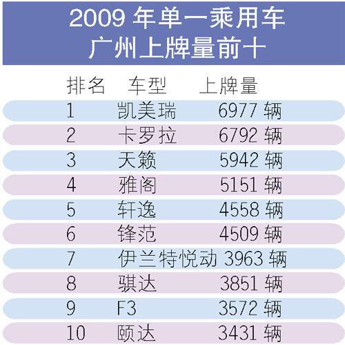 記者從車管所等權(quán)威部門獲得的最新數(shù)據(jù)顯示,2009年廣東省乘用車新車上牌量累計達(dá)683799輛,與2008年相比增幅達(dá)31.04%。其中,廣州乘用車新車上牌量總數(shù)為152235輛,與2008年同比增幅為33.88%,并以1300多輛的微弱優(yōu)勢超越深圳,坐上了全省冠軍寶座。凱美瑞成為 2009年廣州本地最熱銷的車型之一,上牌量達(dá)到6977輛,位居單一車型上牌量首位。