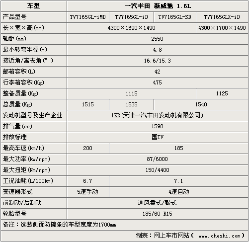 豐田改款新威馳依然由一汽生產(chǎn),同時(shí)將有6款車型推出,變速箱份為4速自動和5速手動。排量上分為1.3升與1.6升。長4300mm×寬1690mm×高1490mm的車身尺寸也與老款車型保持一致,完全可以滿足年輕人在日常中的使用,并且新款車型提供了防擦條選裝件,可增加個性與實(shí)用性。