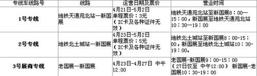 本次北京車展開(kāi)通了兩條車展專用公交車線路和一條新-老國(guó)展展商專線。線路運(yùn)營(yíng)時(shí)間及票價(jià)如下: