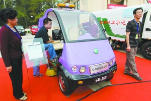 一踏上北京展覽館門前的小廣場,參觀者便立刻被露天擺放在廣場上的各種新能源汽車吸引住了。看起來似乎和普通垃圾車沒什么兩樣的桶裝垃圾運輸車與壓縮式垃圾車,實際上卻是靠電池來運行的;北汽的新能源汽車最高時速已經(jīng)可以達到每小時160公里;小型電動汽車“竹風”只需要30分鐘即可快速充電80%……