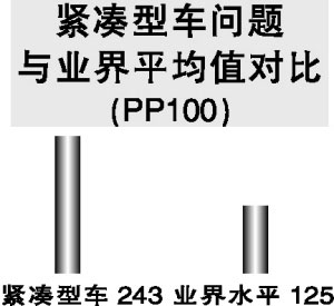 在細(xì)分市場(chǎng)方面,緊湊型車(chē)車(chē)主遇到的問(wèn)題比行業(yè)平均水平高出80%以上,比高檔緊湊型車(chē)用戶的問(wèn)題高出58%。幾乎20%的緊湊型車(chē)車(chē)主都投訴說(shuō)他們遇到的問(wèn)題比預(yù)期的要多,而整個(gè)業(yè)界有此抱怨的客戶也不過(guò)是10%。除此之外,緊湊型車(chē)細(xì)分市場(chǎng)中遇到的產(chǎn)品缺陷和功能障礙數(shù)量(243 PP100)幾乎是業(yè)界總體水平的兩倍(125 PP100)。