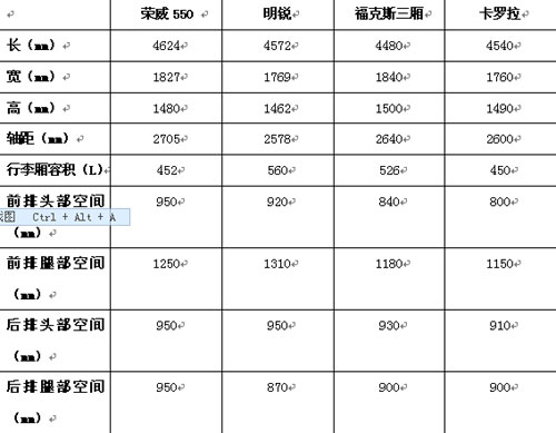 轎車的車身長(zhǎng)度和軸距的大小就決定了汽車內(nèi)部空間的大小。從車身長(zhǎng)度來看,榮威550最長(zhǎng),達(dá)到 4.624米,?怂谷龓疃蹋嚿韮H長(zhǎng)為4.48米,而明銳和卡羅拉則都處于這個(gè)范圍之內(nèi)。