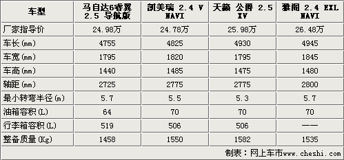 我們選取的四款車型都是位于該車系中的頂配車型,售價都在25萬元左右,馬自達6睿翼在這四款車型中屬于售價比較低的。在車身尺寸方面馬自達6睿翼是4款車型中最小的,同時在軸距方面也只有2725mm,這意味馬自達6睿翼在這四款車型中的內(nèi)部尺寸應(yīng)該是最小的。雅閣的軸距是四款車型最大的,達到了2800mm,保證了雅閣內(nèi)部空間的寬敞。凱美瑞和天籟•公爵都同時擁有2775mm的軸距,它們在內(nèi)部空間上將不會有太大的差距。四款車型中除了馬自達6睿翼外其余三款車型均達到了70升。由于馬自達6睿翼身材較小,所以在整車質(zhì)量方面它也是4款車型中最輕的。