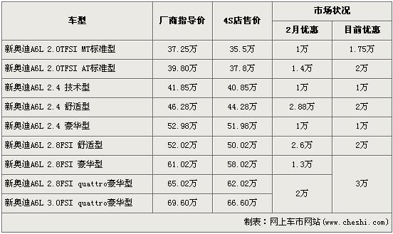 記者從奧迪地區(qū)經(jīng)銷商處了解,奧迪新A6L全系有不同程度優(yōu)惠調(diào)整,最高達(dá)到了3萬元。入門級的2.0TFSI手動標(biāo)準(zhǔn)型優(yōu)惠金額上漲到了1.75萬元,2.0TFSI自動標(biāo)準(zhǔn)型優(yōu)惠金額也上漲到了2萬元。2.4L排量除了舒適型優(yōu)惠金額減小到了2萬元外,同排量其他車型優(yōu)惠金額均沒變。全系高配的2.8FSI四驅(qū)型和3.0FSI四驅(qū)型的售價也從2萬元升到了3萬元,達(dá)到了全系最高。