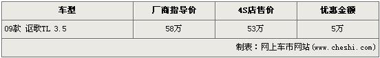 據(jù)4S店銷售人員介紹,在售的只有09款謳歌TL 3.5一種車型,廠商指導(dǎo)價(jià)為58萬元。現(xiàn)在購買09款謳歌TL3.5的消費(fèi)者可以享受到5萬元的現(xiàn)金優(yōu)惠,經(jīng)優(yōu)惠后售價(jià)從58萬元下降到了53萬元。4S店內(nèi)現(xiàn)車比較齊全,消費(fèi)者有一定的挑選空間。
