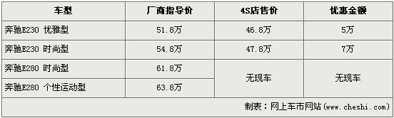 據(jù)4S店銷售人員介紹,奔馳E級現(xiàn)售的車型主要是E230和E280車型,其中E230時(shí)尚型的優(yōu)惠幅度為7萬元,達(dá)到了全系的最高,優(yōu)惠后售價(jià)從54.8萬元降到了47.8萬元。E230優(yōu)雅型優(yōu)惠5萬元,經(jīng)優(yōu)惠后售價(jià)從51.8萬元下降到了46.8萬元。銷售人員還介紹,E280全系店內(nèi)均無現(xiàn)車,所以不在此次降價(jià)范圍內(nèi)。