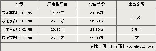 憑越野車起家的雙龍,向來是以生產SUV而著稱的,旗下的雙龍享御更是其的代表之作,其2.0L車型搭載的柴油發(fā)動機更是源于奔馳的技術。雙龍享御共有四款車型,售價區(qū)間為24.38萬元-29.30萬元。近日根據網上車市價格監(jiān)測顯示,雙龍享御全系最高優(yōu)惠1萬元,詳情請看下表: