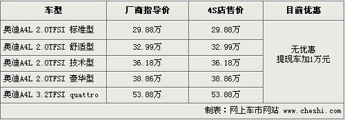 筆者從北京地區(qū)經(jīng)銷商處了解到,目前奧迪A4L現(xiàn)車供應(yīng)比較緊張,現(xiàn)車數(shù)量非常少,款式主要集中在2.0T舒適版和3.2兩款車,各4S店供車情況有一定差異。部分店提現(xiàn)車仍然需要加1萬(wàn)元現(xiàn)金,或者在店內(nèi)做1萬(wàn)元裝飾。消費(fèi)者如果訂車的話,需要交5000元左右訂金,等待一個(gè)月時(shí)間提車。