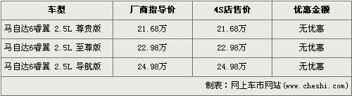 2009年4月12日,在大家的眾所期盼中代表了全球B級(jí)車(chē)最新進(jìn)化方向,經(jīng)過(guò)全新元素設(shè)計(jì)的馬自達(dá)6睿翼正式上市。睿翼率先投放的車(chē)型排量為2.5L,車(chē)型分為尊貴版、至尊版和導(dǎo)航版三款,售價(jià)區(qū)間為21.68萬(wàn)元-24.98萬(wàn)元。現(xiàn)在各家一汽馬自達(dá)經(jīng)銷(xiāo)店已經(jīng)接受睿翼的預(yù)訂,具體車(chē)型價(jià)格請(qǐng)看下表: