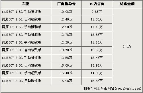 據(jù)東風(fēng)標(biāo)致經(jīng)銷店銷售人員介紹,兩廂標(biāo)致307分為1.6L和2.0L兩種排量,目前全系優(yōu)惠1.1萬元,入門車型的1.6L 手動(dòng)精致版原廠商指導(dǎo)價(jià)為10.98萬元,經(jīng)優(yōu)惠后僅售9.88萬元,排量稍大的2.0L排量的低配車型手動(dòng)精致版經(jīng)優(yōu)惠后售價(jià)為11.18萬元。