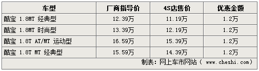 據(jù)4S店銷售人員介紹,此次酷寶系列車型涉及系列內(nèi)各款車型,1.8L手動(dòng)時(shí)尚型及1.8T自動(dòng)版運(yùn)動(dòng)型車型的現(xiàn)車各店最高可給出12000元的現(xiàn)金優(yōu)惠。而1.8T系列車型部分顏色需要訂購(gòu),優(yōu)惠幅度同樣可達(dá)到1.2萬(wàn)元;操控效果極佳的手動(dòng)擋1.8L車型現(xiàn)車充足,享受優(yōu)惠的同時(shí)還可由經(jīng)銷商處添置價(jià)值近千元的車身裝飾,但不能折換現(xiàn)金。