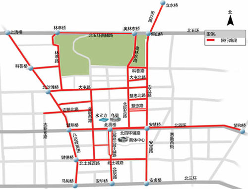 限行路段:建國門橋向北經(jīng)東二環(huán)路、北二環(huán)路主路(不含輔路)至鐘樓北橋(單向);復(fù)興門橋向北經(jīng)西二環(huán)路、北二環(huán)路主路(不含輔路)至鐘樓北橋(單向),除奧運(yùn)專用車輛、公共汽車和持有閉幕式車證的車輛外,禁止其他車輛通行。