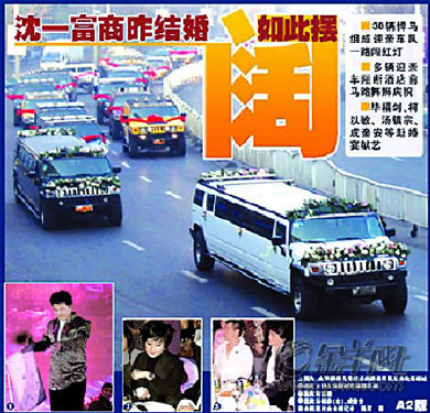 片斷回放:11月24日上午7時許,沈陽市鐵西區(qū)沈遼中路西部汽配城路段,一個自西向東行駛的車隊迎面駛來,一輛豐田霸道越野車(錄像車)行駛在車隊前面,隨后是一白一黑兩輛加長悍馬越野車,再往后就是并排行駛的悍馬越野車和豐田霸道。這些車的前后車牌都貼上了“百年好合”字樣,擋住了車牌號。悍馬打著雙閃一路向東,甚至連紅燈都毫不理會一闖而過。這場婚禮由中央電視臺主持人畢福劍主持,包括柯以敏、成奎安、湯鎮(zhèn)宗等在內(nèi)的明星紛紛登臺獻藝。