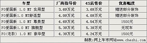 據(jù)比亞迪汽車4S店銷售人員介紹,現(xiàn)在比亞迪F0愛國(guó)版igo系列車型的現(xiàn)車比較齊全,只有旗艦型沒有現(xiàn)車,但消費(fèi)者可以預(yù)訂。售價(jià)3.99萬元的老款舒適型現(xiàn)在已經(jīng)停產(chǎn),而老款豪華型目前還有部分現(xiàn)車銷售。另外,比亞迪FO老款豪華型和尊貴型目前都可以優(yōu)惠現(xiàn)金1500元,實(shí)用型和新舒適型只可以贈(zèng)送部分裝飾。