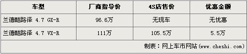 據(jù)經(jīng)銷(xiāo)商銷(xiāo)售人員介紹,豐田-蘭德酷路澤分為4.0L和4.7L兩種排量,由于4.0L車(chē)型的尾氣排放是歐III標(biāo)準(zhǔn),沒(méi)有達(dá)到北京施行的歐IV標(biāo)準(zhǔn),所以北京限賣(mài),店內(nèi)沒(méi)有4.0L車(chē)型。4.7L車(chē)型分為GX-R版和VX-R版,目前低配的4.7L GX-R車(chē)型沒(méi)有現(xiàn)車(chē),所以不在此次優(yōu)惠的行列中。高配的VX-R版經(jīng)5.5萬(wàn)元優(yōu)惠后的售價(jià)也降到了105.5萬(wàn)元。