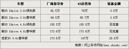 據(jù)經(jīng)銷(xiāo)商處銷(xiāo)售人員介紹,近期購(gòu)買(mǎi)X5的消費(fèi)者可以得到最高26.6萬(wàn)元的優(yōu)惠。新款的寶馬X5 3.0L車(chē)型目前有買(mǎi)車(chē)送一半購(gòu)置稅的活動(dòng),購(gòu)置稅優(yōu)惠的價(jià)值可以直接抵車(chē)價(jià),經(jīng)抵價(jià)轉(zhuǎn)換后,新X5 3.0i領(lǐng)先版和豪華版經(jīng)3.5及3.8萬(wàn)元優(yōu)惠后售價(jià)降為了79萬(wàn)元和85.7萬(wàn)元,新寶馬X5 4.8i車(chē)型目前仍然沒(méi)有優(yōu)惠。銷(xiāo)售人員就介紹,老款的X5 4.8i豪華版有26.6萬(wàn)元的高額優(yōu)惠,售價(jià)從173.6萬(wàn)元降到了147萬(wàn)元。