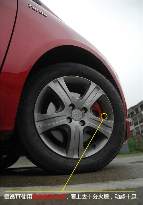 來(lái)到景逸TT的尾部,我們知道之前的版本后尾箱兩側(cè)紅色部分是起到裝飾作用,踩下制動(dòng)板兩邊只有下面兩盞小燈亮起,讓人感覺(jué)廠家既然設(shè)計(jì)出來(lái)為何不用呢?當(dāng)時(shí)廠家并沒(méi)有給出正面回答,但是今天的TT版本將這樣的疑惑解答,LED后尾燈全部亮起,就算是白天也十分明顯,提醒后面車主與之保持安全距離。國(guó)產(chǎn)車?yán)锩嬗羞@么大尾燈的還是第一次看見(jiàn),這可以說(shuō)是該產(chǎn)品的一個(gè)大的亮點(diǎn)之一。新增的“1.8T”的標(biāo)識(shí)顯示了“景逸TT”的出眾與不同,再加上有意更換的前后四輪紅色剎車鉗,撲面而來(lái)的力量感使人頓生駕馭的沖動(dòng)。