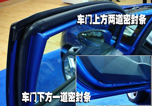新嘉年華在車門(mén)上方提供了兩道密封、車門(mén)下方為一道密封,同樣的在車身門(mén)框的位置也提供了一圈密封條。不過(guò)記者仔細(xì)觀察卻發(fā)現(xiàn)新嘉年華的密封條質(zhì)地比較柔軟,并且這臺(tái)展車已經(jīng)出現(xiàn)了一些扭曲的現(xiàn)象。