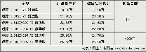 筆者從一汽大眾北京地區(qū)經(jīng)銷商處了解到,目前銷售的邁騰大多為DSG版車型,其中1.8T車型可以現(xiàn)車優(yōu)惠1萬元,2.0排量優(yōu)惠4000元,如果消費者選擇在4S店內做一條龍服務,還將有一定幅度的優(yōu)惠。除新款DSG版車型外,部分4S店還有少量的老款邁騰銷售,現(xiàn)車主要為黑色、銀色等。
