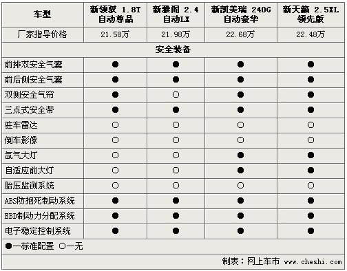 新領馭、新雅閣、新凱美瑞和新天籟作為中級車標桿,其在安全性能方面可謂是下足了功夫。前排安全氣囊、側安全氣囊及電子穩(wěn)定程序等均成為四款車的標準配置。而新凱美瑞和新天籟配備了自適應氙氣大燈,較其它兩款車提升了夜間行駛安全性。除此之外,新雅閣是四款同級車型中唯一沒有配備側氣簾的車型,讓人略感遺憾。