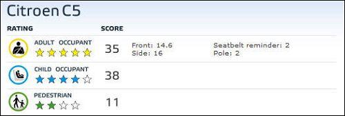 正面碰撞中,C5對于駕駛者的膝部保護(hù)到位,模擬假人膝部未受到傷害,但方向盤對胸部有一定沖擊。側(cè)面碰撞中C5表現(xiàn)出色,獲得滿分。同樣,前排副駕駛安全氣囊可以關(guān)閉,可以放置反向兒童座椅,但C5并未對駕駛者做出足夠提醒。