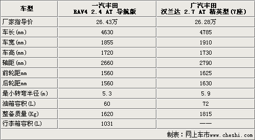通過上表我們可以清楚的看出這兩款車型的外形尺寸情況,毋庸置疑,由于所處車型的級別不一樣,廣汽豐田漢蘭達在長、寬、高都要優(yōu)于一汽豐田RAV4的尺寸。同樣在軸距方面,漢蘭達達到了2790mm比RAV4長出了130mm,這就表明漢蘭達的內(nèi)部空間要明顯優(yōu)越于RAV4。在道路通過性方面要,由于RAV4身材小巧,轉(zhuǎn)彎半徑僅為5.3米,使其可以更好的適應(yīng)中國道路的特點。油箱容積廣汽豐田漢蘭達達到了72升,而一汽豐田RAV4只有60升。