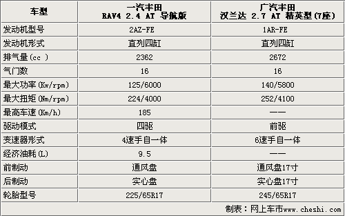 一汽豐田RAV4 2.4自動導(dǎo)航版和廣汽豐田漢蘭達2.7精英型7座這兩款車型都采用的是直列四缸的引擎,只是在發(fā)動機排量上不同。漢蘭達和RAV4的發(fā)動機都具有豐田獨步天下的VVT-i技術(shù),實現(xiàn)了卓越的動力輸出,同時進一步提高了燃油經(jīng)濟性。在變速器方面,RAV4就相對比較落后了,只采用了4檔自動變速器。而漢蘭達的6速手自一體變速箱則可以讓駕駛者充分的享受到駕駛的樂趣。一汽豐田RAV4和廣汽豐田漢蘭達都采用的是前通風(fēng)盤式后實心盤式的剎車,但漢蘭達的剎車盤達到了17寸,可以更有效的降低剎車距離。