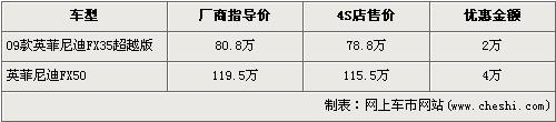 據(jù)英菲尼迪4s店銷售人員介紹,目前店內(nèi)銷售的FX系列有FX50和09款FX35兩款車型。英菲尼迪FX50近期出現(xiàn)了首次優(yōu)惠,降幅為4萬元,經(jīng)優(yōu)惠后售價(jià)從119.5萬元降到了115.5萬元。并且09新款的FX35超越版車型有2萬元優(yōu)惠,售價(jià)也降到了78.8萬元。