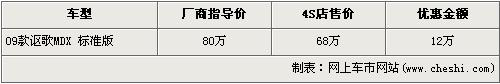 據(jù)經(jīng)銷商銷售人員介紹,09款謳歌-MDX的現(xiàn)金優(yōu)惠12萬元,優(yōu)惠后售價(jià)也從原廠商售價(jià)80萬降到了68萬,首次跌破了70萬元。銷售人員還介紹,09款謳歌MDX增加的實(shí)用性的配件包括前下護(hù)板和后下護(hù)板,能避免惡劣路況對(duì)底盤帶來的損傷,并且09款謳歌MDX還新增了巴厘海藍(lán)和摩卡褐金兩種顏色,店內(nèi)現(xiàn)車非常充足,顏色也比較全,欲購買者挑選的空間非常大。