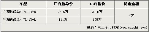 據(jù)經(jīng)銷商銷售人員介紹,豐田-蘭德酷路澤分為4.0L和4.7L兩種排量,由于4.0L車型的尾氣排放是歐III標(biāo)準(zhǔn),沒有達(dá)到北京施行的歐IV標(biāo)準(zhǔn),所以北京限賣,店內(nèi)沒有4.0L車型。4.7L車型分為GX-R版和VX-R版,目前購(gòu)買蘭德酷路澤的消費(fèi)者可以得到6萬元的優(yōu)惠。經(jīng)優(yōu)惠后,GX-R版售價(jià)降為了90.6萬元,VX-R版售價(jià)降到了105萬元。銷售人員還介紹,店內(nèi)沒有蘭德酷路澤現(xiàn)車,預(yù)購(gòu)買者需交訂金1萬元,約等一個(gè)半月可提車。