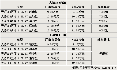 今年三月份,長安鈴木的全新天語SX4正式上市,這款新車型共有涵蓋1.6L、1.8L兩個排量10款車型。全新天語SX4在動力系統(tǒng)、外觀造型、功能設(shè)置、安全駕控和舒適配置方面,實現(xiàn)全面升級,進(jìn)一步完善了長安鈴木的產(chǎn)品線。近日,全新天語SX4在長安鈴木4S店內(nèi)出現(xiàn)了更多的優(yōu)惠幅度,最高可達(dá)8000元。