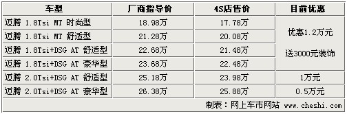 據(jù)4S店銷售人員介紹:目前邁騰最高優(yōu)惠1.2萬元,店內(nèi)購車還可送3000元裝飾,裝飾包括地膠、腳墊、汽車防爆膜等。目前邁騰現(xiàn)車充足,1.8Tsi車型銷量較好,所以車源較為豐富,但2.0Tsi豪華型無現(xiàn)車需預定,預定需等20天左右。由于2.0Tsi兩款車型銷量較少,所以優(yōu)惠幅度較少,如果您對動力性要求不是非常高的話,1.8Tsi車型可以滿足您的需求,建議購買。