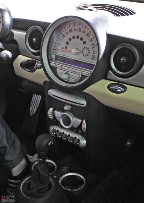 坐進(jìn)MINI的車內(nèi),一個(gè)圓形的白色大儀表盤非常惹眼,可電子顯示車速、油量、冷卻劑以及其他功能狀態(tài)等信息。這種布局自從1968年以來一直是MINI典型特征。控制臺(tái)下方帶有6個(gè)條形小開關(guān)是從原創(chuàng)MINI繼承而來的,這些開關(guān)均為彈簧式按鈕,使用后自動(dòng)彈回原來狀態(tài)。