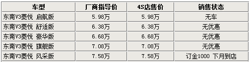 據(jù)東南經(jīng)銷商處銷售人員介紹,目前V3菱悅?cè)惮F(xiàn)車正在逐步充足貨源,最低配的車型仍因尚未投產(chǎn)而無法購買,請消費者諒解。V3系列其它的幾款高配車型各店仍需要預(yù)訂,暫時無法滿足消費者購車即提車的需要。同時銷售人員還說,現(xiàn)在購車沒有任何形式的現(xiàn)金優(yōu)惠,僅有精美的裝飾贈送。而即將上市的V3菱悅風(fēng)采版則需在訂車后等待一個月的時間才可提車,訂金為1000元。