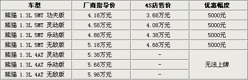 據(jù)吉利汽車4S店銷售人員介紹,熊貓1.3L手動(dòng)擋車型目前都有現(xiàn)車銷售,而自動(dòng)擋雖然已經(jīng)上市,但由于北京地區(qū)無(wú)法上牌,所以還沒(méi)有現(xiàn)車抵達(dá)北京市場(chǎng),預(yù)計(jì)最早會(huì)在今年8月份解決無(wú)法上牌的問(wèn)題。目前熊貓1.3L手動(dòng)擋全系可以優(yōu)惠五千元,而這款車型還增加了電動(dòng)升級(jí)后窗,需要在原價(jià)的基礎(chǔ)上加1000元。