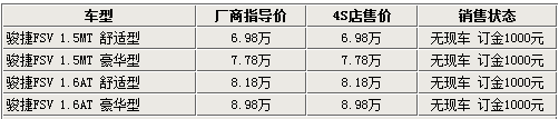 經(jīng)銷商透露,現(xiàn)在各店內(nèi)的FSV基本為展車或已被客戶預(yù)訂的車輛,基本沒(méi)有現(xiàn)車可以滿足消費(fèi)者的需要,消費(fèi)者如需購(gòu)買可以繳納1千元訂金后等待一個(gè)月左右即可提車。由于駿捷FSV為剛剛上市的新車,所以店內(nèi)沒(méi)有任何形式的優(yōu)惠,請(qǐng)消費(fèi)者諒解。