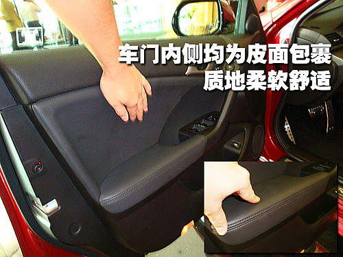 車門內(nèi)板為高檔真皮包裹,而且軟硬適中,手臂長時間擱置不會感到不適。