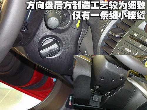 在上面的圖片我們可以非常明顯的看到:在轉(zhuǎn)向柱和鑰匙孔周?chē)忍幍哪>吖に嚤容^高,且接縫均勻,整體感較強(qiáng)。思鉑睿的油門(mén)和剎車(chē)踏板均為橡膠包裹,踏板面積較大,力度適中。并且剎車(chē)踏板行程較短,并且很靈敏。