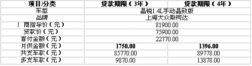 貸款解析:晶銳早在上市之初就被眾多消費(fèi)者所關(guān)注,相比競(jìng)爭(zhēng)對(duì)手本田飛度,本田鋒范,馬自達(dá)2等車型來(lái)說(shuō),晶銳在定價(jià)方面有一定的優(yōu)勢(shì),時(shí)尚精致的外觀和上海大眾品牌的良好口碑,使它的市場(chǎng)表現(xiàn)比較不錯(cuò)。首付2萬(wàn)余元,月供近1400元的貸款購(gòu)車方式也比較誘人。