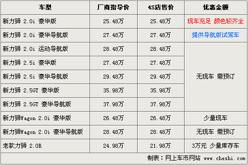據(jù)斯巴魯北京地區(qū)4S店銷售人員介紹:新款力獅已經到店,目前全部為2.0i豪華版及Wagon豪華版,2.0i現(xiàn)車比較充足,顏色有藍色、白色、銀色、黑色、灰色可選。另外還提供了2.0i導航版為試駕車,而老款力獅還有少量庫存車,現(xiàn)優(yōu)惠3萬元。