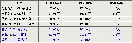 據(jù)北京地區(qū)一汽馬自達(dá)4S店銷售人員介紹,目前購(gòu)買睿翼或馬自達(dá)6均有較大的優(yōu)惠幅度。睿翼車型全系優(yōu)惠現(xiàn)金1.5萬(wàn)元,且現(xiàn)車顏色齊全,同時(shí)老款車型最高讓利2.7萬(wàn)元,車價(jià)最低僅為15.28萬(wàn)元。并且購(gòu)買新老車型均有裝飾贈(zèng)送,新老款車型消費(fèi)者可以根據(jù)需求選購(gòu)。北京地區(qū)各4S店由于訂單不同,各店銷售的現(xiàn)車顏色有所不同。