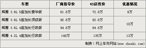 據(jù)北京進口大眾經(jīng)銷店銷售人員介紹,目前輝騰3.6L 5座加長豪華版有9萬元的現(xiàn)金優(yōu)惠,經(jīng)優(yōu)惠后3.6L 5座加長豪華版的售價降到了72.8萬元。排量稍大的4.2L 4座加長行政版有13萬元的優(yōu)惠,經(jīng)優(yōu)惠后售價從148萬元下降到了135萬元。銷售人員還介紹,4.2L輝騰沒有現(xiàn)車,欲購買的消費者需交訂金10萬元預訂。