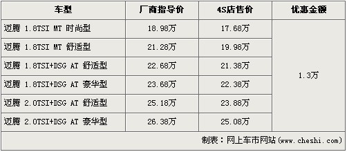 據(jù)北京一汽大眾經(jīng)銷(xiāo)店銷(xiāo)售人員介紹,邁騰全系車(chē)型全系優(yōu)惠1.3萬(wàn)元。經(jīng)1.3萬(wàn)元的優(yōu)惠后,全系入門(mén)級(jí)的1.8TSI MT時(shí)尚型的售價(jià)從18.98萬(wàn)元下降到了17.68萬(wàn)元。全系最高配的邁騰2.0TSI豪華版經(jīng)1.3萬(wàn)元優(yōu)惠后,售價(jià)降到了25.08萬(wàn)元。銷(xiāo)售人員還介紹,目前邁騰全系現(xiàn)車(chē)都比較充足。