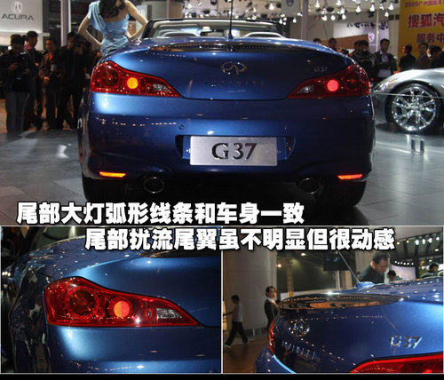G37敞篷版的尾部大燈設(shè)計(jì)與前大燈交相呼應(yīng),同時(shí)尾部的小型擾流尾翼也為尾部增添了動(dòng)感色彩。車身簡(jiǎn)潔的線條個(gè)性很鮮明,流暢中蘊(yùn)含著無限動(dòng)能與速度感,讓人過目難忘。