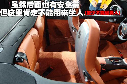 2010款保時捷911 Turbo敞篷版前排座椅為一體式運動型座椅,支撐有力且皮質手感舒適。除座椅下方的電動調節(jié)按鈕外,在椅背側面還設計了手動扳手,從而方面后排乘客上下車。由于雙后座受到流線車體縮減的局促空間,并不適合體型略壯碩的成人長途乘坐。