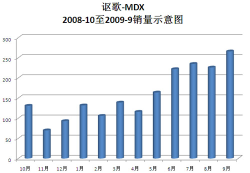 謳歌MDX是繼謳歌TL和RL兩款轎車(chē)引入國(guó)內(nèi)之后的第三款車(chē)型,謳歌MDX投放國(guó)內(nèi)市場(chǎng)后,一改謳歌TL和RL轎車(chē)平淡的銷(xiāo)量表現(xiàn)。通過(guò)上表近一年的銷(xiāo)量可以看出,謳歌MDX單月最高銷(xiāo)量已經(jīng)超過(guò)250臺(tái),并且表現(xiàn)強(qiáng)勁的上升態(tài)勢(shì)。